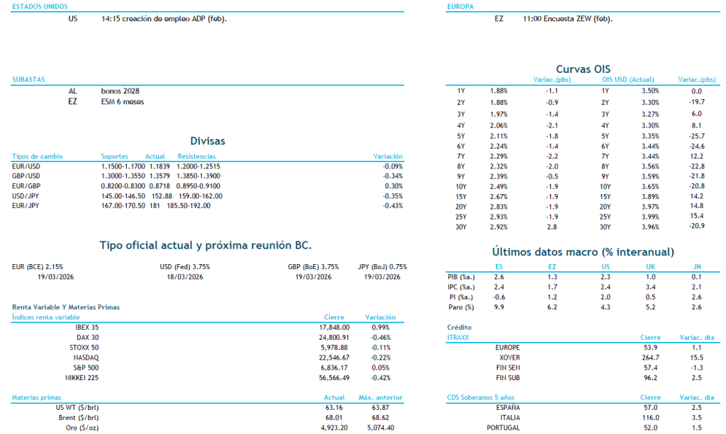 La agenda macro destaca hoy por el indicador de sentimiento inversor alemán ZEW y el índice manufacturero Empire en EEUU. En cuanto a primarios, Alemania emite hoy bonos a 2 años y seguimos pendientes de que España anuncie un nuevo sindicado a 30 años. Ayer el Tesoro fijó por debajo de lo esperado su objetivo para la subasta de este jueves (4.500-5.500 mill. EUR), cuando emitirá un nuevo bono a 5 años (mayo 2031).