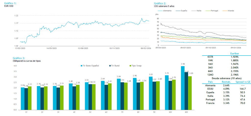 Sesión de corte claramente defensivo en mercados globales, condicionada por la escasa liquidez tras los festivos en EEUU y gran parte de Asia por el Año Nuevo Lunar. Los futuros estadounidenses abren en rojo, acompañando al movimiento de “risk-off” de la renta fija, con el bono alemán a 10 años en el 2,73% de TIR y el norteamericano en el 4,02%.