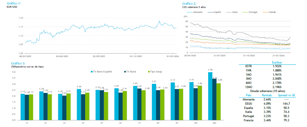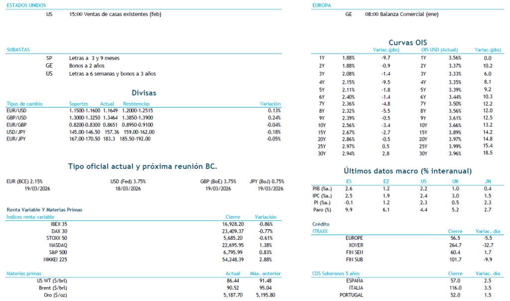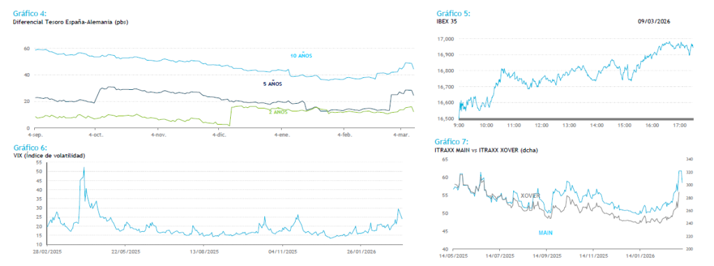Donald Trump afirmó que el conflicto con Irán podría resolverse “muy pronto”, aunque reiteró que las operaciones militares continuarán hasta que el enemigo sea “total y decisivamente derrotado”. El petróleo vuelve a acercarse a 90 USD el barril, mientras los futuros de renta variable vienen con subidas superiores al 2%. En cuanto a la curva, la 2-10 alemana repunta hasta 57 pb desde los 44 puntos vistos ayer, y el descuento de subidas del BCE está en +19 pb ahora mismo, muy lejos de los 49 pb de ayer. Los diferenciales periféricos, pese a la volatilidad intradía, mostraron un comportamiento ordenado: el bono italiano a 10 años llegó a ampliarse 10 pb frente al Bund a la apertura, pero cerró incluso algo más estrecho. La Casa Blanca también estudia posibles exenciones a algunas sanciones petroleras mientras las rutas energéticas del Golfo siguen bajo presión. En el estrecho de Ormuz persisten los cuellos de botella en el tráfico marítimo y varios buques han reportado interferencias electrónicas, lo que mantiene elevada la incertidumbre sobre el flujo energético mundial. Desde Teherán, el ministro de Exteriores iraní advirtió que su país tiene una experiencia “muy amarga” negociando con Washington, lo que reduce las expectativas de avances diplomáticos a corto plazo. Analistas advierten que el conflicto representa un nuevo shock para unos mercados ya debilitados por tensiones comerciales y presiones inflacionistas, lo que podría limitar la efectividad de la estrategia tradicional de “comprar las caídas”. Los ministros de Energía del G-7 celebrarán una reunión virtual para analizar los riesgos sobre el suministro global de energía. En el ámbito corporativo, Aramco anunció un aumento de su dividendo base del cuarto trimestre y el lanzamiento de un programa de recompra de acciones de 3.000 millones de dólares. Al mismo tiempo, el sector financiero asiático vive una creciente competencia por talento ante el aumento del flujo de operaciones corporativas. Las implicaciones macroeconómicas del shock energético comienzan a reflejarse en las expectativas de política monetaria. Vladimir Putin instó a las compañías energéticas rusas a aprovechar los altos precios para reducir deuda y advirtió que la producción en el Golfo podría detenerse en un mes. Moscú también estudia reducir sus ventas de gas a la Unión Europea. Este escenario complica el panorama para los bancos centrales, con el BCE, la Reserva Federal y el Banco de Inglaterra reuniéndose la próxima semana en un entorno marcado por el riesgo inflacionista. En Asia, los datos comerciales de China sorprendieron al alza: las exportaciones crecieron cerca de un 22% en los dos primeros meses del año y las importaciones de crudo aumentaron un 16% por el proceso de acumulación de reservas. Japón revisó al alza su crecimiento del cuarto trimestre hasta el 1,3% anualizado, impulsado por la inversión empresarial. India intensificó el apoyo a la rupia y al mercado de bonos ante la volatilidad del petróleo.