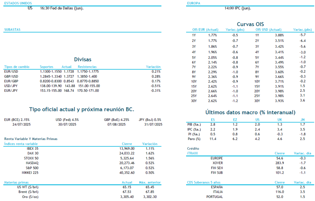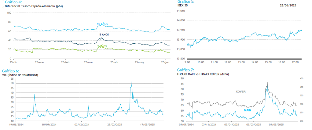 Cierre positivo de la renta variable a pesar de las crecientes tensiones comerciales entre EEUU y China. Ayer, el secretario de Tesoro , Scott Bessent, propuso una tregua arancelaria larga a cambio de que China aplace su plan de endurecer los límites sobre tierras raras críticas. Por otro lado, los bonos siguen con el rally después de que hace unos días se rompieran niveles clave de la tendencia bajista en la que hemos estado todo el año. Podríamos ver cierta corrección, pero la sensación es que el movimiento va a continuar ayudado por el tono dovish de los bancos centrales y la bajada de las emisiones en los últimos meses del año. En EEUU, el 4% del Treasury a 10y ha sido testado un par de veces y de momento aguanta con las dos bajadas de tipos para este mes de octubre y diciembre totalmente descontadas y con los miembros más dovish de la FED presionando como ayer Miran señalando q las tensiones comerciales con China (especialmente por restricciones en exportaciones de minerales raros) representan un riesgo material para el crecimiento, lo que refuerza la urgencia de recortes y no ve primas de riesgo significativas en los mercados, salvo en el oro.