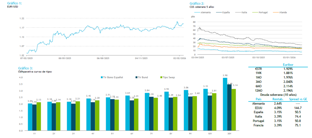 El buen dato de empleo publicado ayer en EEUU descarta totalmente la posibilidad de ver recortes de tipos en la reunión de marzo y supone un catalizador para la economía americana. Actualmente la curva de tipos descuenta para este año dos bajadas de 25 puntos básicos con un 100% de probabilidad y un 14% de probabilidad de una tercera. En el mercado primario esta semana hemos visto emisiones hasta el momento por un importe de hasta 52.5 bios de euros, superando el volumen emitido durante la semana pasada. Ayer la subasta en Francia del bono con vencimiento 30 años tuvo una gran acogida por parte del mercado con una demanda de 135 bios de euros para un importe de 8 bios. Sin embargo, la subasta de ayer del bono americano con vencimiento 10 años fue algo mas débil de lo esperado con un ratio de cobertura de 2.39 veces frente a 2.55 de la subasta anterior. Hoy emitirán el 30 años y en Italia un 3 y un 7 años. La volatilidad sigue en los metales preciosos y en el caso del oro algún Banco de Inversión americano fija en 6.300 dólares la onza como nivel objetivo para este año.