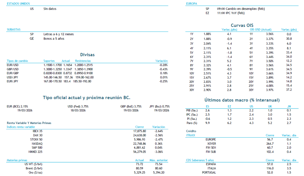 El nerviosismo inicial que se vió en la apertura de los mercados en el día de ayer fue disminuyendo a lo largo de la sesión, con el precio del crudo corrigiendo desde los máximos del día. La referencia Brent se sitúa esta mañana en los 80$ por barril. Sin embargo, los futuros del Gas han repuntado más de un 20% después de que la planta más grande de Qatar haya parado sus exportaciones, generando incertidumbre sobre cuánto tiempo permanecerán paradas y su impacto en los suministros energéticos mundiales. El franco suizo protagonizó uno de los movimientos más significativos, subiendo el par EURCHF una figura desde los mínimos del día por los comentarios de su banco central sobre una posible intervención en el mercado fx para frenar la apreciación de su divisa. El cruce EURUSD, por su parte, se encuentra cotizando por debajo de la media de 200 (1,1769). Ayer volvimos a tener sorpresa por los datos macro en EEUU con la publicación del ISM manufacturero más alto de lo esperado. Además, la partida de precios pagados repuntó a niveles no vistos desde mediados del 2025 (70,5 vs 60 estimado), dando más impulso al dólar y disminuyendo las probabilidades de recortes de tipos de interés por parte de la Fed. En la sesión de hoy sólo se publican datos relevantes en Europa, aunque el principal driver continuará siendo el conflicto geopolítico.