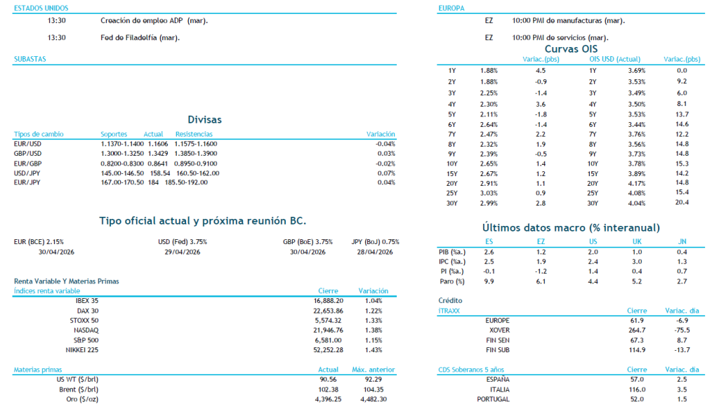 Finalmente, el mercado parece haber puesto a la Administración Trump contra las cuerdas, obligando a reajustar la retórica ante los efectos negativos que los ataques están teniendo. Por un lado, el coste de la guerra, estimado en 1.400 M$ diarios, y con la petición del Pentágono de un presupuesto extraordinario de 200.000 M$, petición de fondos que el Congreso podría rechazar. Por otro, el shock de precios, con la Fed revisando al alza las perspectivas de inflación para este 2026, echando por tierra los tan ansiados recortes de tipos que tanto ha demandado Trump. Además, a nivel internacional, se ha encontrado con el rechazo de la mayoría de potencias aliadas en su intento de proteger el estrecho de Ormuz. Y por último, la cuestión interna del precio de la gasolina en EE.UU., superando los 4 $/galón y marcando máximos desde 2022. Todo ello, combinado, con la cercanía de las elecciones de medio mandato, actúa como catalizador adicional que presiona a la Casa Blanca a buscar algún tipo de desescalada.
