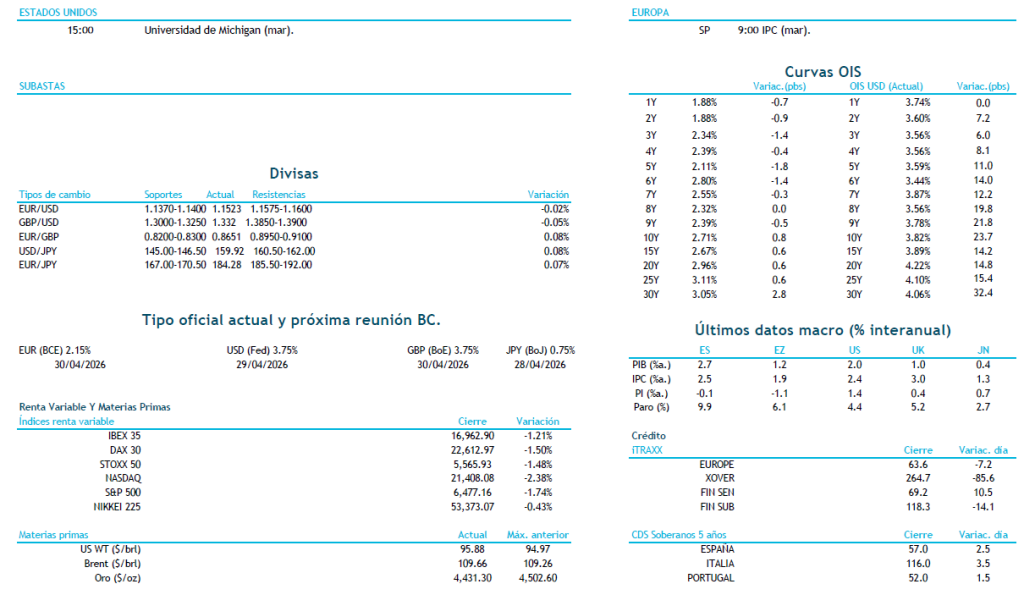 El mercado de deuda volvió a experimentar ayer una sesión marcada por el temor a una inflación más persistente. La renta fija sufrió un claro sell-off, con ampliaciones significativas en los spreads soberanos y corporativos a lo largo de la curva, reflejando la creciente aversión al riesgo entre los inversores.