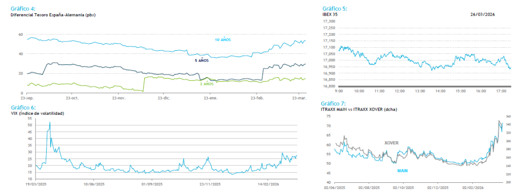 Trump prorrogó su plazo inicial de 5 días y ahora concede a Irán una extensión adicional de 10 días, fijando la nueva fecha límite en el 6 de abril de 2026, tras asegurar que las conversaciones “continúan y progresan muy bien”, sin embargo, sus declaraciones no lograron frenar la presión vendedora. De forma paralela, The Wall Street Journal ha informado de que el Pentágono está evaluando el posible envío de hasta 10.000 soldados adicionales a Oriente Medio, como parte de un refuerzo terrestre que ampliaría el margen de maniobra militar de Estados Unidos en caso de que las negociaciones fracasen. Este movimiento se interpreta como una estrategia de presión combinada: mantener abierta la vía diplomática mientras se incrementa la presencia militar en la región. El Bund superó el nivel psicológico del 3% —situándose ahora en torno al 3,08%—, y aunque estos niveles podrían empezar a atraer cierto interés comprador, la incertidumbre de cara al fin de semana sigue limitando la toma de posiciones largas.