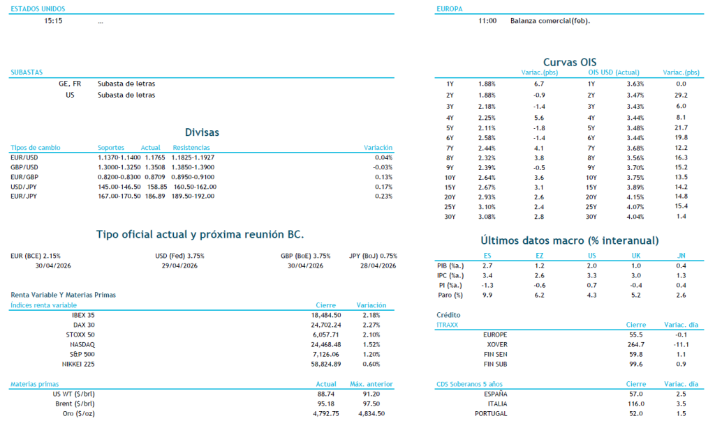 “Frágil alto el fuego”, así es como algunos analistas se han referido a la situación actual que atraviesa el conflicto. Si el viernes parecía que la situación estaba prácticamente resuelta con la apertura del estrecho de Ormuz, llevando a una relación del precio del crudo, en las últimas horas hemos visto como esto se ha ido desvaneciendo. La referencia Brent ha recuperado esta madrugada todo lo perdido el viernes, situándose en 95$ por barril actualmente. Destaca también la subida del precio del gas natural en Europa, llegando a subir un 12% el futuro TTF desde el mínimo visto el viernes. En el mercado de divisas, la consecuencia ha sido una apreciación del dólar. El par EURUSD ha marcado el mínimo esta noche en 1,1729, manteniéndose dentro del rango de niveles importantes, con el soporte en 1,1670 y la resistencia en 1,1820. En referencia a la libra esterlina, esta semana se publican datos relevantes en Reino Unido, como las referencias de empleo e inflación. Además, el Primer Ministro, Keir Starmer, se enfrenta hoy a la Cámara de los Comunes para abordar la polémica en torno a la contratación de Peter Mandelson. De nuevo, iniciamos una semana clave en torno al conflicto. Mañana finaliza la tregua de dos semanas acordada con todas las opciones aún abiertas, aunque el sentimiento posicionado más a que el conflicto no se alargue mucho más en el tiempo. Mientras que en la agenda macro la publicación de los PMI como avance a la situación económica en el mes de abril de las principales economías será lo más relevante.
