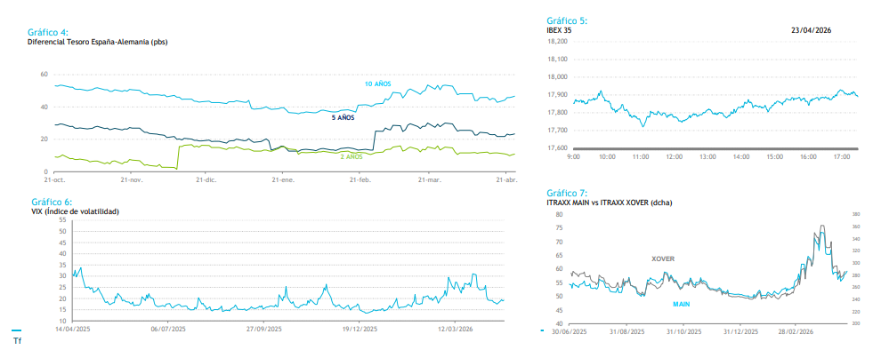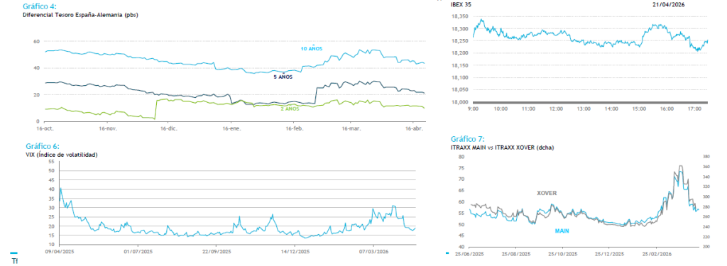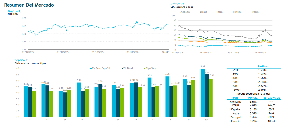 Optimismo ante la posibilidad de que EEUU e Irán retomen las negociaciones antes de que mañana por la noche (hora de Wahington) expire el alto el fuego. El petróleo retrocede un 1.40% mientras que los bonos siguen soportados y las bolsas en máximos, a pesar de que las dos partes siguen insistiendo en sus líneas rojas. Trump ha comentado que no pretende extender el alto el fuego. Por otro lado, ayer la presidenta del BCE, Lagarde, recalcó que las repercusiones económicas de la guerra en Irán aún no han alcanzado el escenario adverso del ECB. Nos encontramos entre el escenario base y el adverso. Los factores que dificultan la respuesta de la política monetaria es la duración de la crisis y el posible efecto contagio de los precios de energía sobre la inflación general. Con esto dio a entender que la reunión de la semana que viene llega muy pronto como para realizar ajustes en los tipos, ya que el banco central sigue recabando más datos. Actualmente la curva descuenta 46 puntos de bajada este año, la primera en julio y la segunda con un 84% de probabilidad en diciembre.