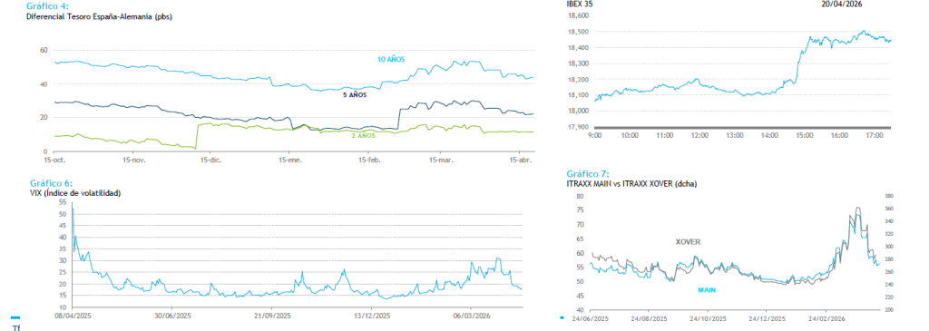 El conflicto en Oriente Medio se ha recrudecido esta madrugada después de que EEUU interceptara un buque de carga iraní que intentaba romper su bloqueo marítimo lo que ha llevado a Irán a prometer represalias. Las perspectivas de una segunda ronda de negociaciones siguen siendo inciertas ante la expiración del alto el fuego este martes ya que Irán se niega a participar a menos que se levante el bloqueo. Mientras el Tesoro de EEUU ha prorrogado un mes más las exenciones a las sanciones sobre el petróleo ruso. Avances para el crudo del 6% hasta los 95 dólares el barril y tímidas subidas para las bolsas asiáticas de medio punto. El viernes Moody´s rebajó la calificación crediticia A Bélgica un escalón hasta situarlo en A1 con outlook estable debido a la poca capacidad por parte de su Gobierno para poder implementar medidas fiscales y estructurales para combatir el déficit fiscal Esta semana el foco estará en los datos de PMIs que se publicarán este jueves. Además los Bancos españoles comenzarán a publicar sus resultados, siendo el primero de ellos Bankinter este jueves.