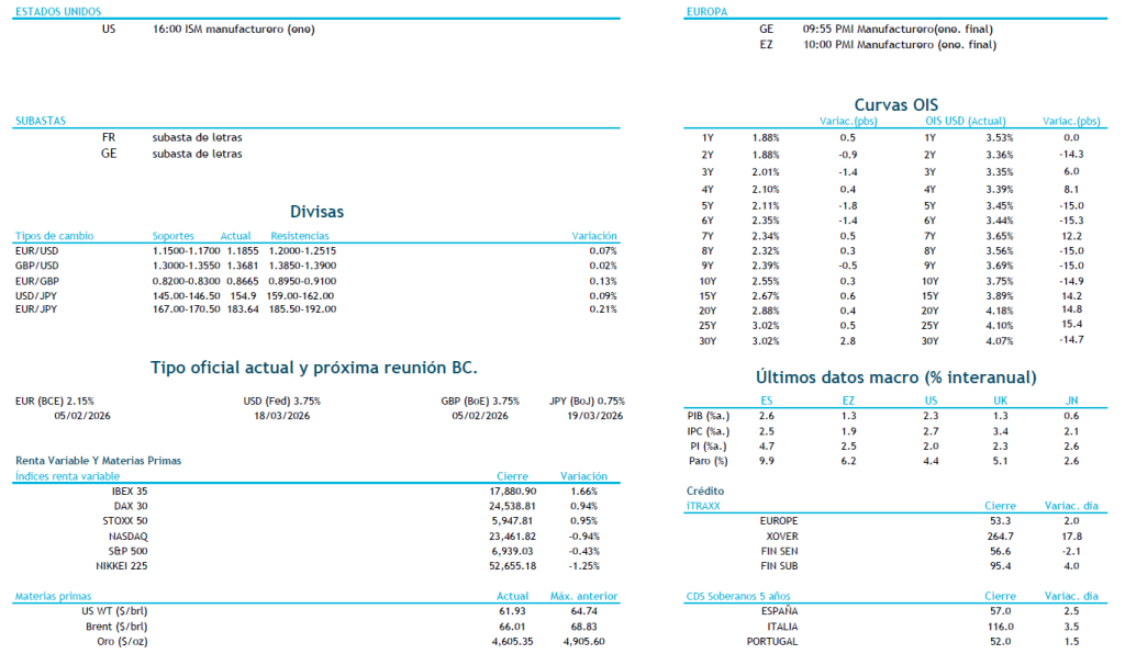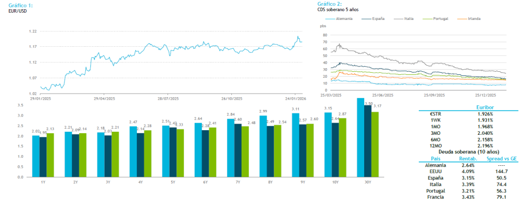 Finalmente, el viernes, Donald Trumpo anunció que Kevin Warsh será el sucesor de Powell al frente de la Reserva Federal. Kevin Warsh quien dejó formar parte del Consejo de Gobernadores de la Reserva Federal gobernador en 2011 al oponerse a la expansión del Balance vía Quantitative Easing (QE) y estar más preocupado por la inflación y el crecimiento. La fuerte caída de precio de los metales (oro en 4.500 USD la onza) parece estar lastrando el sentimiento del mercado, aunque la renta fija se mantiene estable con el bono alemán a 10 años en el 2,85% de TIR y las primas de riesgo ligeramente más altas que la semana pasada. La semana arranca con datos importantes como los PMI de la Eurozona y el ISM manufacturero en EEUU. Aun así, lo más importante llegará el jueves, con las reuniones del BCE y el BoE, ambos en modo pausa. En el caso del BCE, no se esperan cambios, con Lagarde evitando dar pistas antes de la actualización de previsiones de marzo. El BoE también debería mantener tipos en el 3,75%, respaldado por un repunte reciente en inflación y expectativas aún elevadas de precios y salarios. Ya el jueves en EEUU conoceremos el ISM de servicios, pero el plato fuerte llegará el viernes, con la cifra de creación de empleo del mes de enero. Además, continuaremos conociendo resultados empresariales, en concreto más de 100 compañías del S&P y en España se publicarán los resultados del Banco Santander y BBVA entre otros. Hoy el Departamento del Tesoro publicará sus necesidades de financiación trimestrales (Quarterly Borrowing Estimates), donde adelanta las necesidades de financiación y la estrategia previa al refunding del miércoles. El mercado espera un anuncio continuista, manteniendo el tamaño de las subastas de bonos sin cambios y un mayor uso de las letras para cubrir la financiación a corto plazo. El foco estará en el objetivo de la cuenta del Tesoro (TGA). El consenso lo sitúa en torno a 750.000-800.000 millones de USD. S&P mejoró su perspectiva sobre la deuda italiana a gracias a la mejora de la posición externa y a las menores necesidades de financiación en el medio plazo.