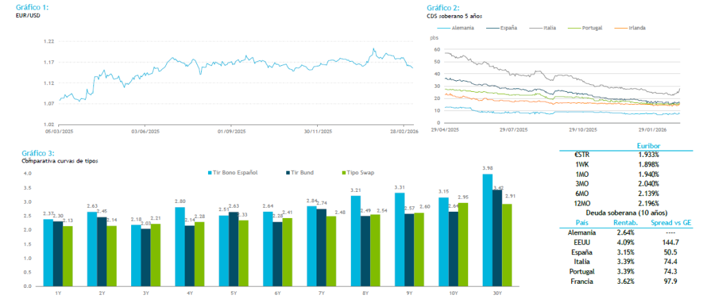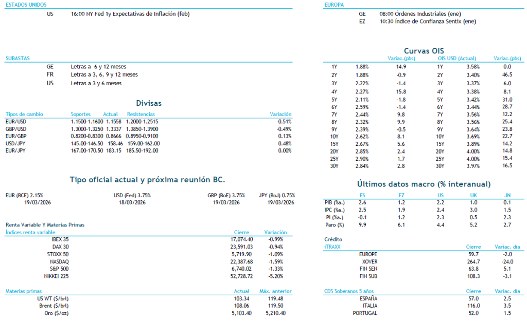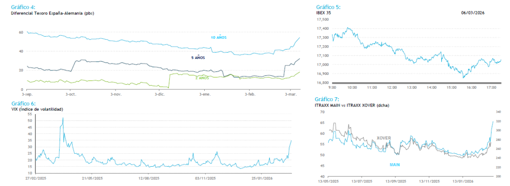 El precio del petróleo se ha disparado un 29% en la sesión de hoy, situándose en niveles no vistos desde julio de 2022, en lo que sería la mayor subida de precio en un solo día de toda la historia. Algunos países exportadores, como Iraq o Kuwait han interrumpido la producción por miedo a las disrupciones en el transporte por el estrecho de Ormuz, y a la sensación de que el conflicto bélico va a ser más prolongado de lo inicialmente calculado, mientras los ayatolás de Irán desafían a Estados Unidos e Israel nombrando como nuevo líder supremo al hijo de Alí Jamenei. Israel ha amenazado con eliminar al nuevo líder, mientras los países asiáticos son especialmente vulnerables a este conflicto por su gran dependencia energética. En el mercado de FX, el dólar americano se aprecia en su papel de refugio, mientras el euro, la libra y el yen pierden terreno. Los riesgos de un repunte en la inflación global desploman las probabilidades de bajadas adicionales de tipos de interés por parte de los bancos centrales, a pesar de que el crecimiento económico mundial se verá muy afectado. La moneda americana se beneficia del status exportador de productos energéticos de Estados Unidos, en contraste con los países europeos y asiáticos, netamente importadores y muy dependientes. Renta variable y bonos son castigados duramente en un contexto de clara aversión al riesgo. Cuanto más dure el conflicto mayor será el daño económico. El sorprendente mal dato de empleo americano publicado el pasado viernes supuso una pausa en la compra del billete verde, pero hoy ese efecto se ha desvanecido y los operadores vuelven a comprar el dólar ante la gran incertidumbre existente en el mercado.