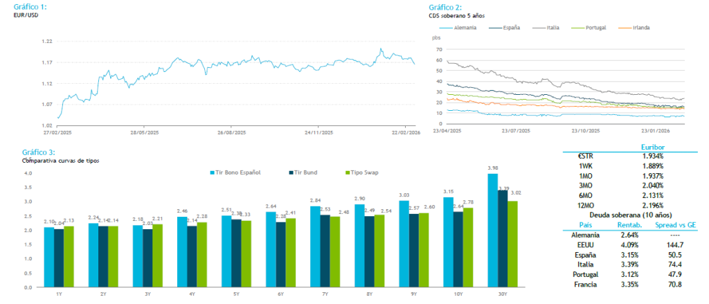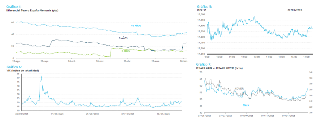 El nerviosismo inicial que se vió en la apertura de los mercados en el día de ayer fue disminuyendo a lo largo de la sesión, con el precio del crudo corrigiendo desde los máximos del día. La referencia Brent se sitúa esta mañana en los 80$ por barril. Sin embargo, los futuros del Gas han repuntado más de un 20% después de que la planta más grande de Qatar haya parado sus exportaciones, generando incertidumbre sobre cuánto tiempo permanecerán paradas y su impacto en los suministros energéticos mundiales. El franco suizo protagonizó uno de los movimientos más significativos, subiendo el par EURCHF una figura desde los mínimos del día por los comentarios de su banco central sobre una posible intervención en el mercado fx para frenar la apreciación de su divisa. El cruce EURUSD, por su parte, se encuentra cotizando por debajo de la media de 200 (1,1769). Ayer volvimos a tener sorpresa por los datos macro en EEUU con la publicación del ISM manufacturero más alto de lo esperado. Además, la partida de precios pagados repuntó a niveles no vistos desde mediados del 2025 (70,5 vs 60 estimado), dando más impulso al dólar y disminuyendo las probabilidades de recortes de tipos de interés por parte de la Fed. En la sesión de hoy sólo se publican datos relevantes en Europa, aunque el principal driver continuará siendo el conflicto geopolítico.