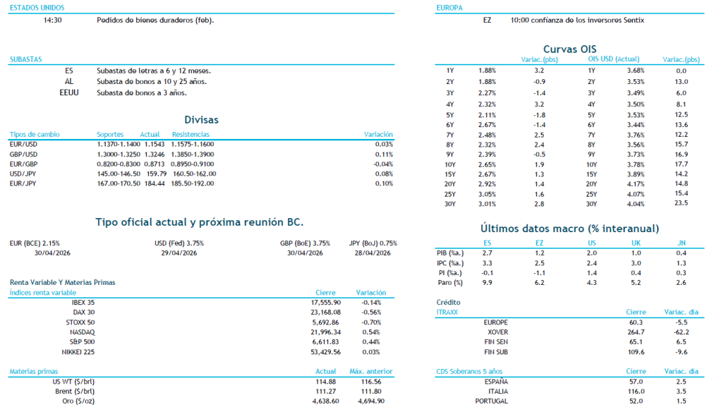 En cuanto a datos macro, hoy se publican los PMI’s finales de abril en la Eurozona y las órdenes de bienes duraderos en EE. UU. Sin embargo, el foco de la semana estará en inflación estadounidense, con el PCE subyacente el jueves y el IPC de marzo el viernes, donde el conflicto con Irán y los efectos base podrían empujar la inflación general por encima del 3%. En cuanto a emisiones, hoy tenemos letras españolas a 6 y 12 meses, mientras que Alemania emite bonos a 10 y 25 años y EE. UU. colocará bonos a 3 años por la tarde.