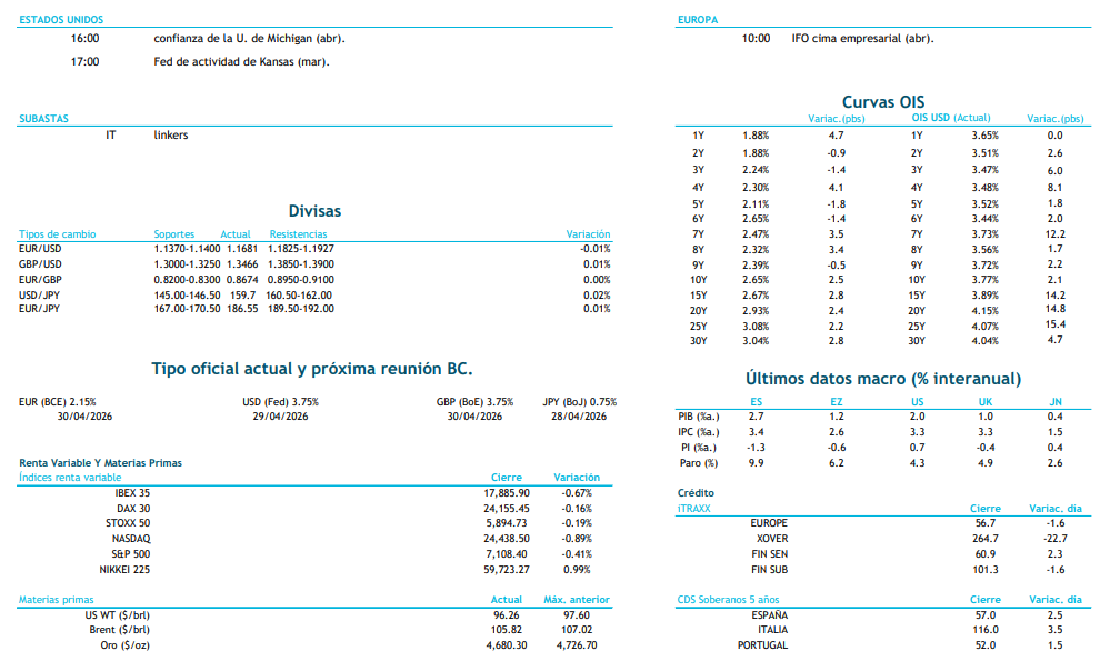 El optimismo sobre los avances en las negociaciones del conflicto en Oriente Medio continúa, con el mercado apuntando a un escenario menos inflacionista y, por lo tanto, con mejores perspectivas para el crecimiento económico. Esto ha provocado que las probabilidades de subidas en los tipos de interés para las reuniones de los bancos centrales de las principales economías que tendrán lugar en las próximas dos semanas se hayan desdibujado por completo, a excepción de Australia, que se espera que continúe con la senda alcista de tipos que ya había iniciado antes de que estallase la guerra. El precio del crudo se mantiene sin muchas variaciones, con la referencia Brent cotizando por debajo de los 95$ por barril y el WTI en 86$, a unas horas del fin de la tregua entre EEUU e Irán. Trump ayer le dio poca probabilidad a ampliar el alto el fuego, mostrando más una urgencia en llegar a un acuerdo que a una extensión del conflicto. En la jornada de hoy también atraerá la atención del mercado el discurso de Kevin Warsh ante el Senado, dónde se espera que hable de la independencia de actuación de la Fed con respecto al poder político y su opinión acerca de la evolución de los tipos de interés en EEUU. Antes del estallido de la guerra, Warsh se había mostrado a favor de reducir los tipos de interés en línea con el discurso de Trump. La libra esterlina se ha apreciado ligeramente tras los datos de empleo publicados a primera hora de la mañana en Reino Unido. La tasa de desempleo ha caído desde el 5,2% al 4,9% mientras que las ganancias semanales medias han repuntado dos décimas. El cruce EURUSD permanece sin mucha dirección a la espera de conocerse algún tipo de noticia en torno al desarrollo del conflicto, cotizando dentro del rango que llevamos resaltando los últimos días, con el soporte en la media móvil de las 200 últimas sesiones en 1,1676 y la resistencia en la zona de 1,1820.