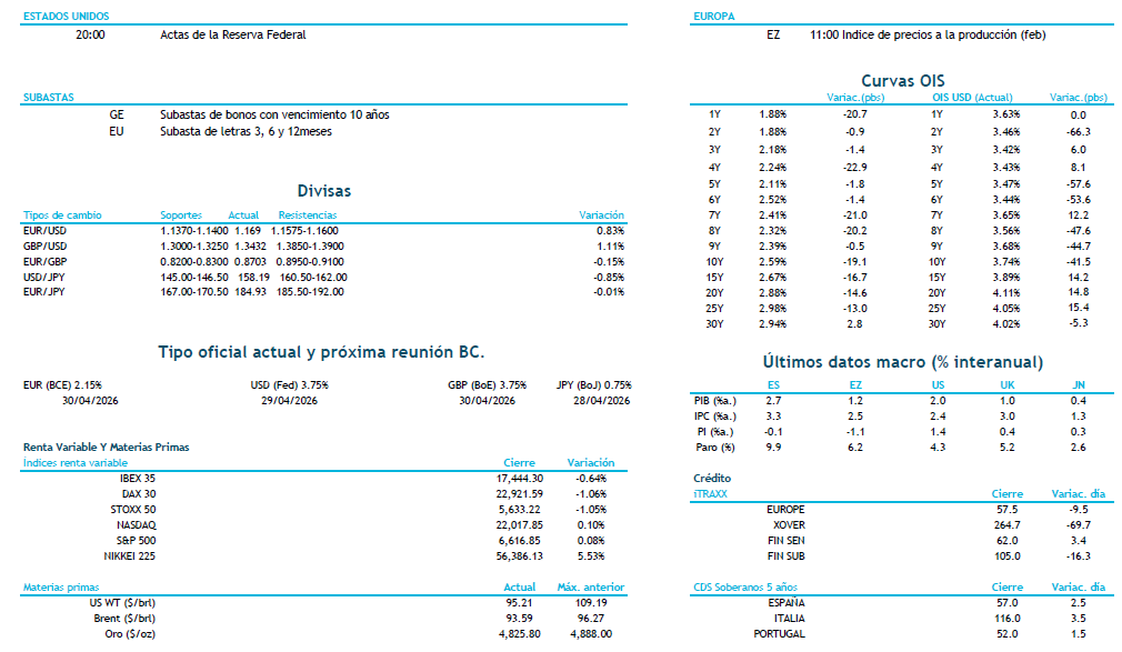 Alivio en los mercados tras la tregua de dos semanas entre Irán y EE. UU. anunciada por Trump ayer a las 00:30 a cambio de que Irán garantice la reapertura del Estrecho de Ormuz. Además, señaló que había recibido una propuesta de Irán de diez puntos, que según el presidente americano es un buen punto de partida para las negociaciones. El petróleo retrocede un 15%, en lo que es su mayor caída en casi seis años, el bund cae 18 puntos básicos hasta marcar el 2.90% de rentabilidad mientras que el Nikkei sube un 5.48%. Parece, por tanto, que el mercado da credibilidad a dicha tregua y a la voluntad de continuar con las negociaciones y así poner fin al conflicto. La agenda del día estará marcada por las actas de la última reunión de la Fed. En el mercado primario veremos subastas por parte de Tesoro americano, alemán y de la Unión Europea, entre otros, mientras que en el mercado de crédito esperamos ver más emisiones que ayer en la que se emitieron 3.44 bios de euros en tres covered .