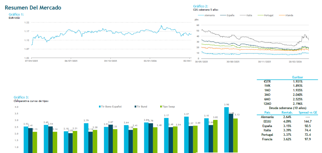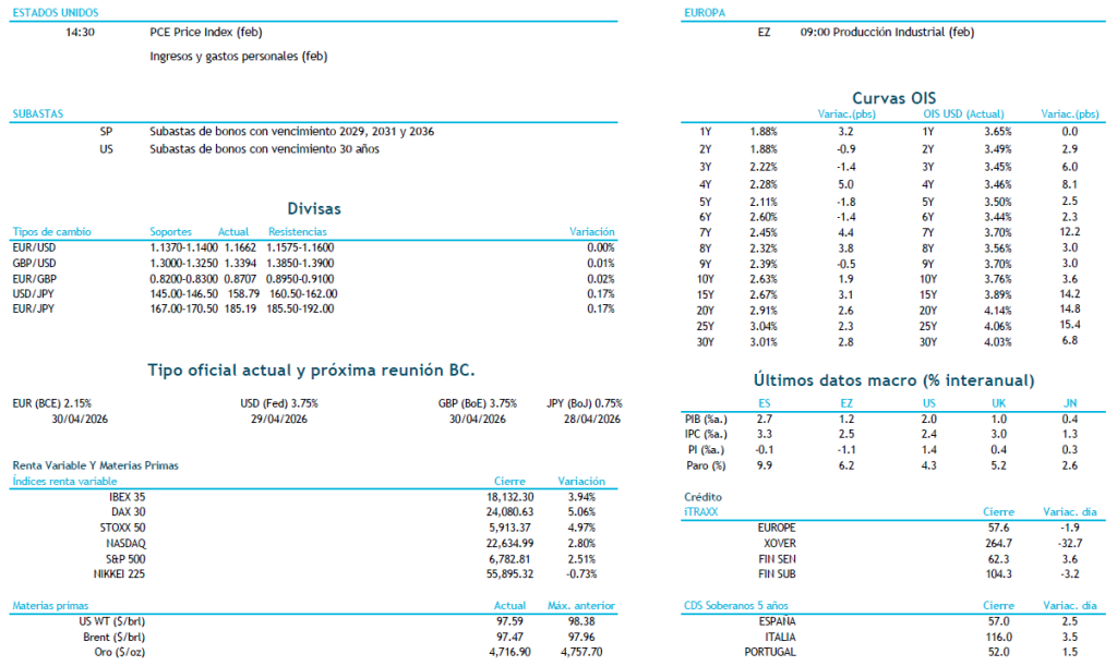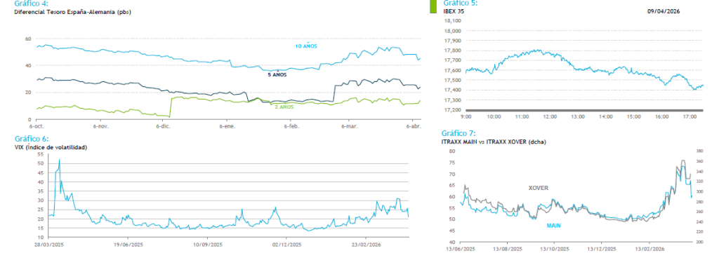 Alivio en los mercados tras la tregua de dos semanas entre Irán y EEUU anunciada por Trump ayer a las 00:30 a cambio de que Irán garantice la reapertura del Estrecho de Ormuz. Los mensajes siguen siendo contradictorios en relación con el cierre del estrecho de Ormuz y los ataques en el Líbano subrayan la fragilidad del alto el fuego provocando algo de corrección en el mercado. Irán exige que se incluya el Líbano y EEUU habla de malentendido mientras que Israel sigue con la intención de completar sus objetivos y no parece que vaya a estar a favor de no atacar a hezbola en el Líbano. El secretario general de la OTAN, Mark Rutte comentó tras su reunión en la Casa Blanca que la misma fue cordial, aunque señaló la clara decepción de Trump con la alianza. Trump publicó un mensaje incisivo en Truth Social, pero sin amenazas de retirada de la OTAN, probablemente limitado por la legislación que exige la aprobación de una super mayoría del Senado. Además, amenazó con aranceles del 50% a países que suministren armas a Irán. Tanto el Brent como el WTI se sitúan en torno a los 97 dólares, avanzando ligeramente al alza. Mientras, ayer por la tarde se publicaron las Actas de la reunión mantenida por la Reserva Federal el 17 y 18 de marzo y que muestran la preocupación de sus miembros por mantener a raya el objetivo de inflación en el 2% y del pleno empleo ante la incertidumbre relacionada por el conflicto. Esperamos para hoy que el mercado continue moviéndose a tirones con cualquier noticia, pero siendo cada vez más consciente de la urgencia de Trump por salir del conflicto, por lo que el mercado de deuda debería mantenerse sostenido. Hoy el Tesoro emite bonos a 3, 5 y 10 años mientras que en EEUU se emitirán bonos con vencimiento 30 años