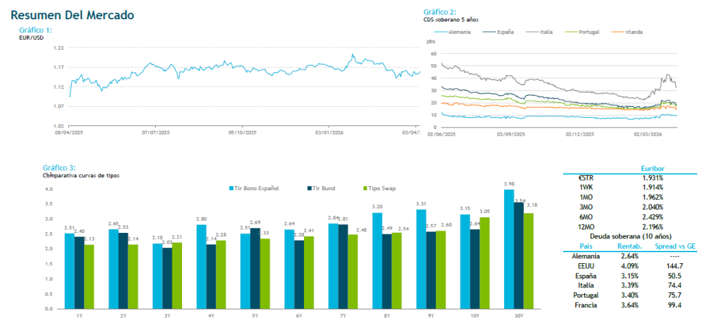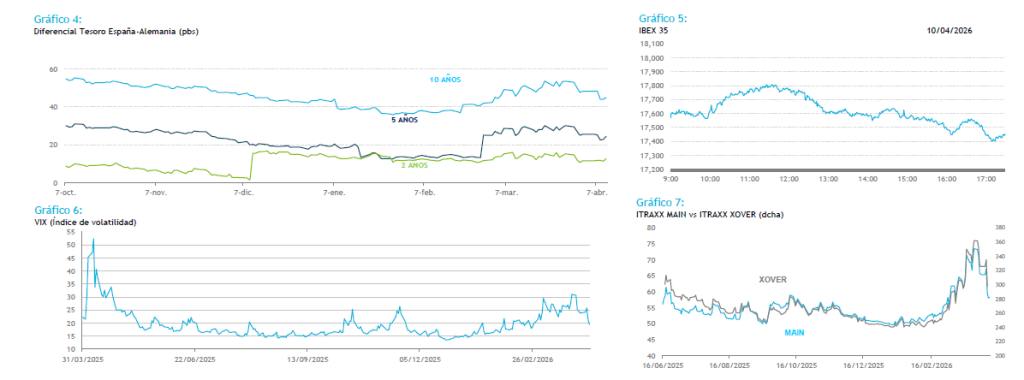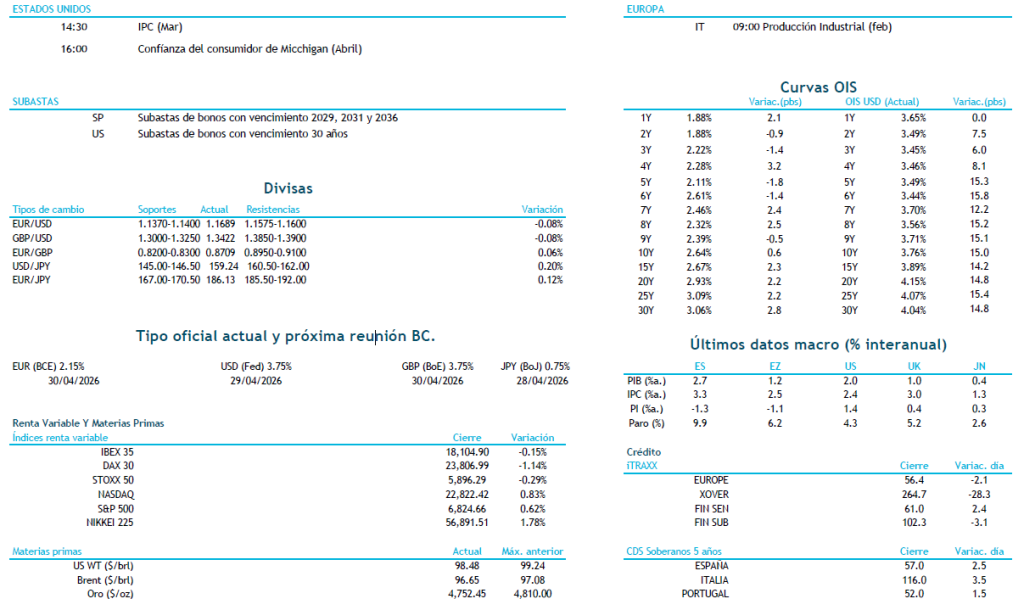 El mercado empieza a descontar la posibilidad de que se alcance algún tipo de acuerdo durante el fin de semana en Pakistán, entre Estados Unidos e Irán con el Líbano, aunque el estrecho de Ormuz sigue sin estar realmente abierto. Además, Trump ya ha comentado que Irán no se está esforzando lo suficiente. Finalmente, los índices americanos terminaron con ligeras subidas y en Asia el Nikkei ha avanzado un 1.84%, después de que Israel abriera la puerta a negociar con el Líbano la semana que viene ante la presión internacional y tras la petición de Trump de que ponga fin a las intervenciones. En el mercado primario el ritmo de emisiones se ha incrementado estos dos últimos días. En lo que va de año se llevan emitidos un total de 744 bios de euros, 0.5% por encima que el año pasado en las mismas fechas. El Tesoro ya ha completado el 36% de sus necesidades de Funding para el año. En cuanto a flujos, destacar ventas en España en la zona del 5 y 10 años de la curva. En la agenda del día ya hemos conocido el dato de IPC en Alemania que ha salido en línea con lo esperado y con el dato anterior, 2.7%. Por la tarde se publicarán los datos de IPC en EEU y Alemania. Por último, hoy a cierre de mercado , la agencia revisará el rating a Francia, quien tiene con outlook negativo.