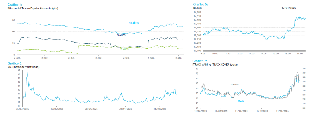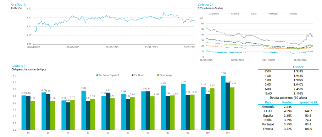 En renta fija, los bonos soberanos abren ligeramente a la baja, presionados por el repunte del crudo -con el Brent acercándose a 112 USD por barril- y el movimiento previo al alza de los treasuries el viernes, tras un dato de creación de empleo más sólido de lo esperado. Seguimos prudentes en duración y spreads de Bunds a corto plazo.