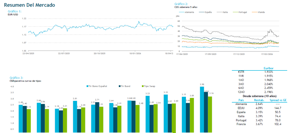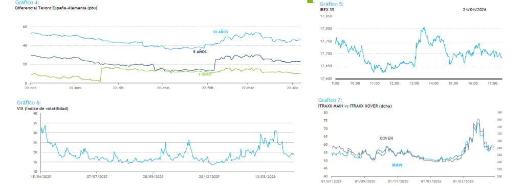 La ausencia de negociaciones y el bloqueo del estrecho de Ormuz mantienen los precios de la energía lo suficientemente altos para que se haya producido un repricing de la curva de tipos, por lo que las próximas semanas podríamos ver un aumento de la volatilidad de cara a las reuniones de los bancos centrales. Además de las noticias relacionadas con el conflicto geopolítico, en la sesión de hoy también tendremos la publicación del Ifo Alemán para el mes de abril, y el dato final del índice de la Universidad de Michigan, dónde veremos si se confirma el dato más bajo de expectativas económicas del consumidor de los últimos 50 años.